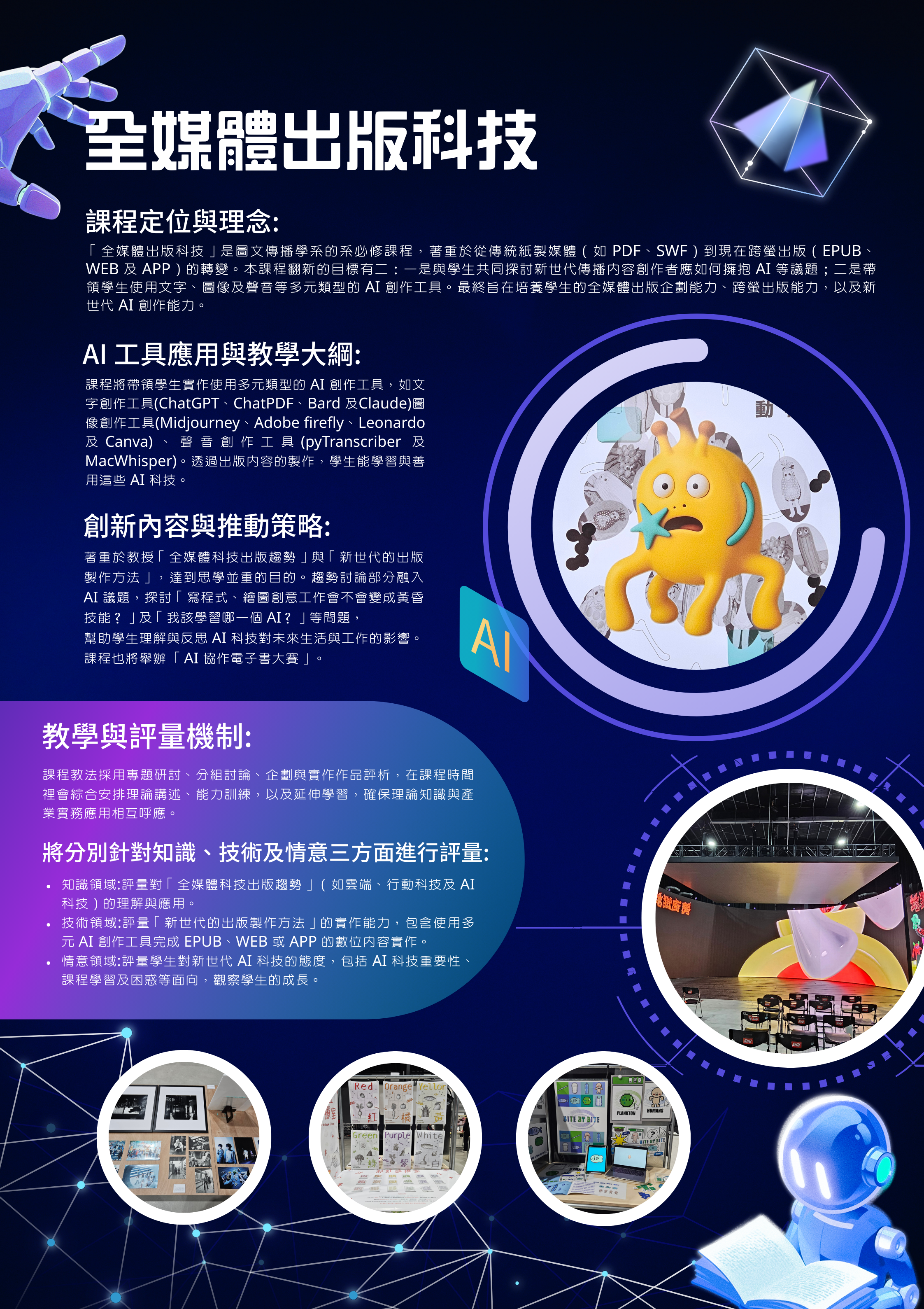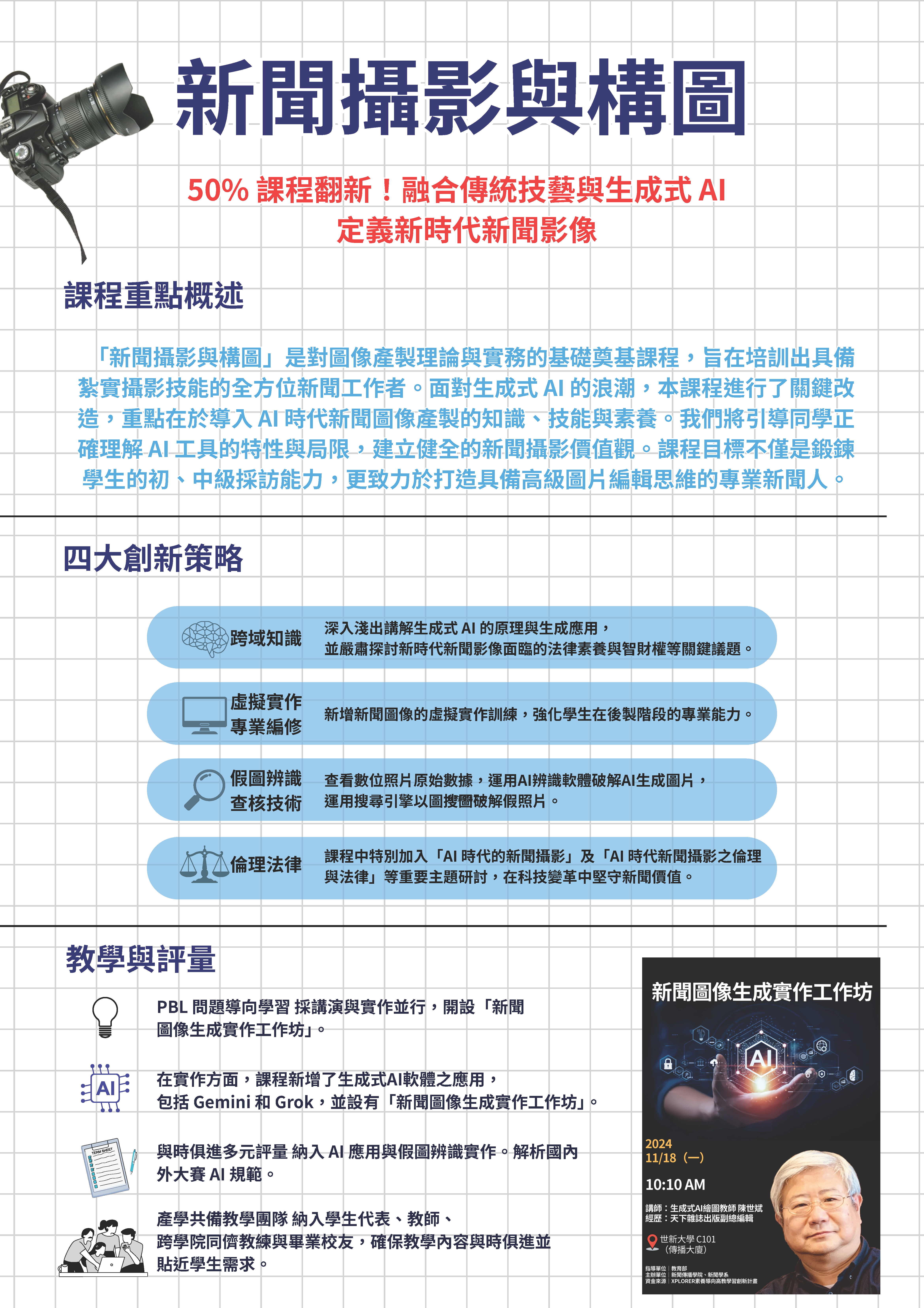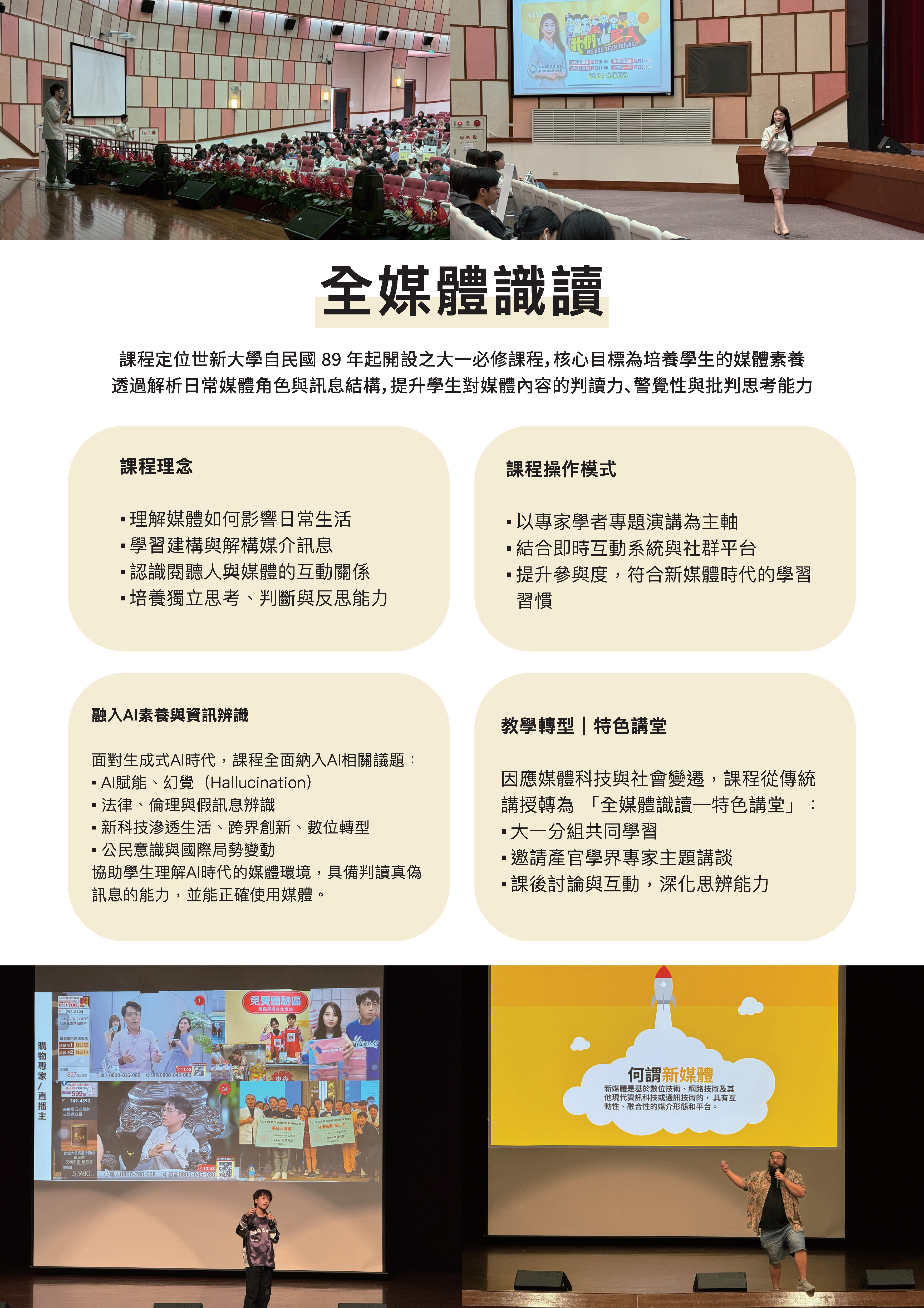 為協助大學新生適應、定向,並透過新開課程自助探索。本計畫以傳院課程設計為主軸,新開一門大一八系必修課程,「生成式AI素養與傳播技能」,及結合兩門系必修「探索公關廣告」、「探索圖文傳播」,另分別將AI素養融入新聞學系、圖傳系與公廣系,調整五門課程分別為「全媒體識讀」、「設計基礎」、「新聞攝影與構圖」、「全媒體出版科技」、「初階數位圖像廣告製作」,讓全校學生在基礎核心素養的養成過程中,不僅能吸收專業知識、且能在以人為本的基礎上反思相關議題與社會責任,尤其AI對大學生學習的指引與影響,並激發主動求知的探索精神,培養實事求是研究性格。本計畫將推動重點與方法包括:透過課程導入AI資料治理與法律素養、透過課程導入資訊倫理素養、透過課程導入媒體素養與假訊息辨識能力在人工智慧時代,媒體素養教育需要建構與人工智慧相關的知識和技能,透過課程讓學生學習AI時代下,必須重新認識的媒體與資訊素養,從世新校園出發,讓未來的媒體人都能有基本的媒體識讀力並正確使用媒體,辨別真假訊息。
