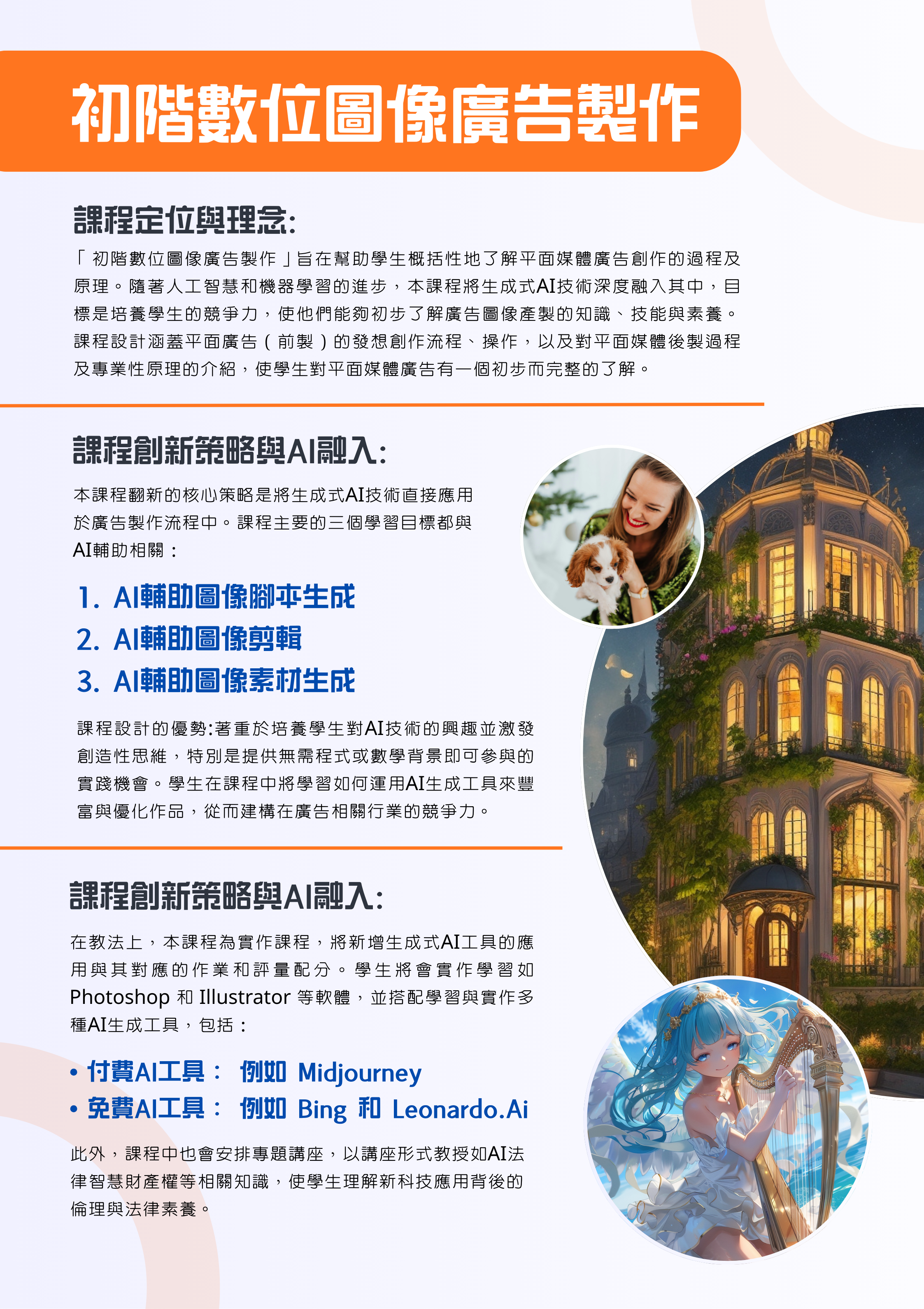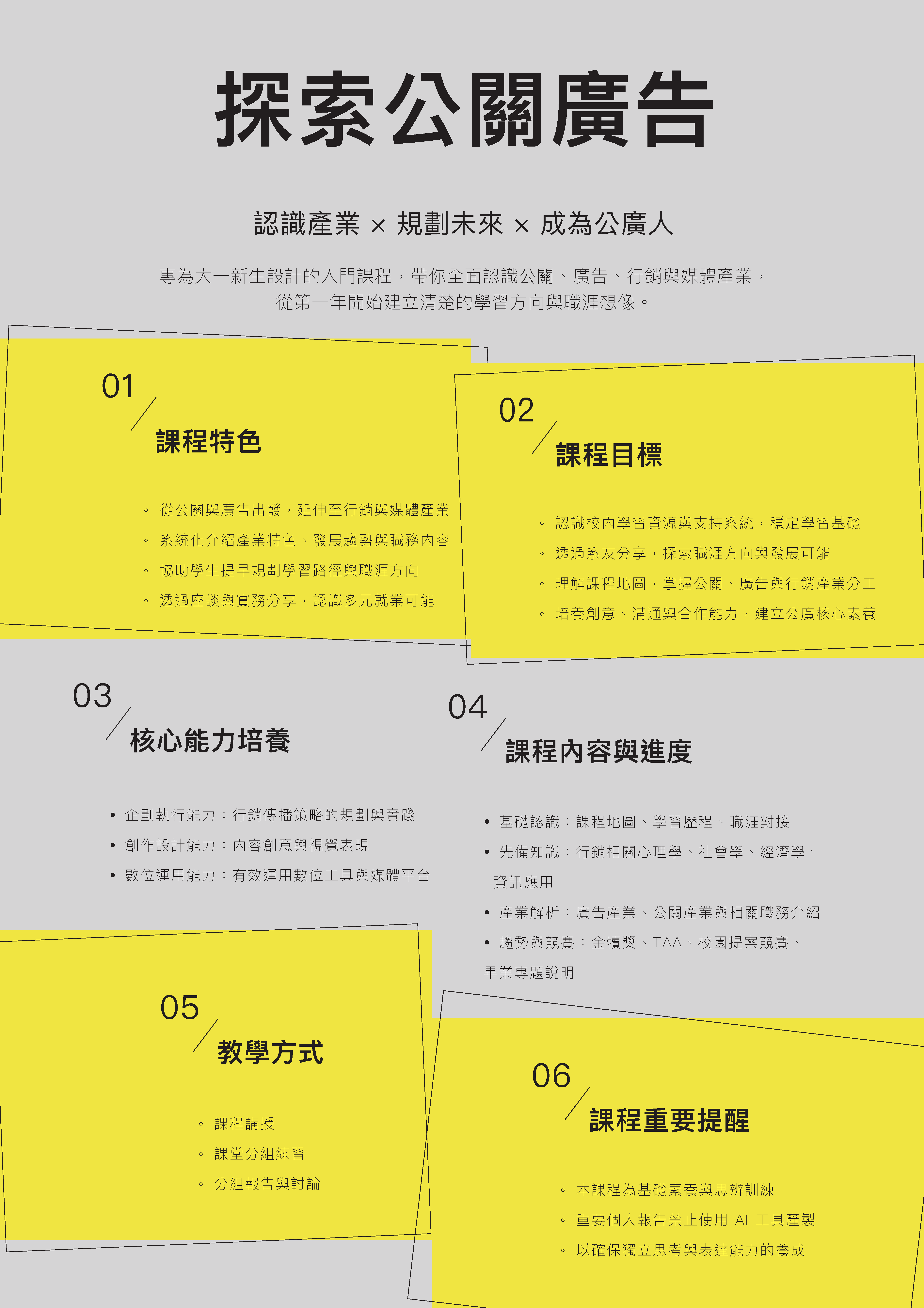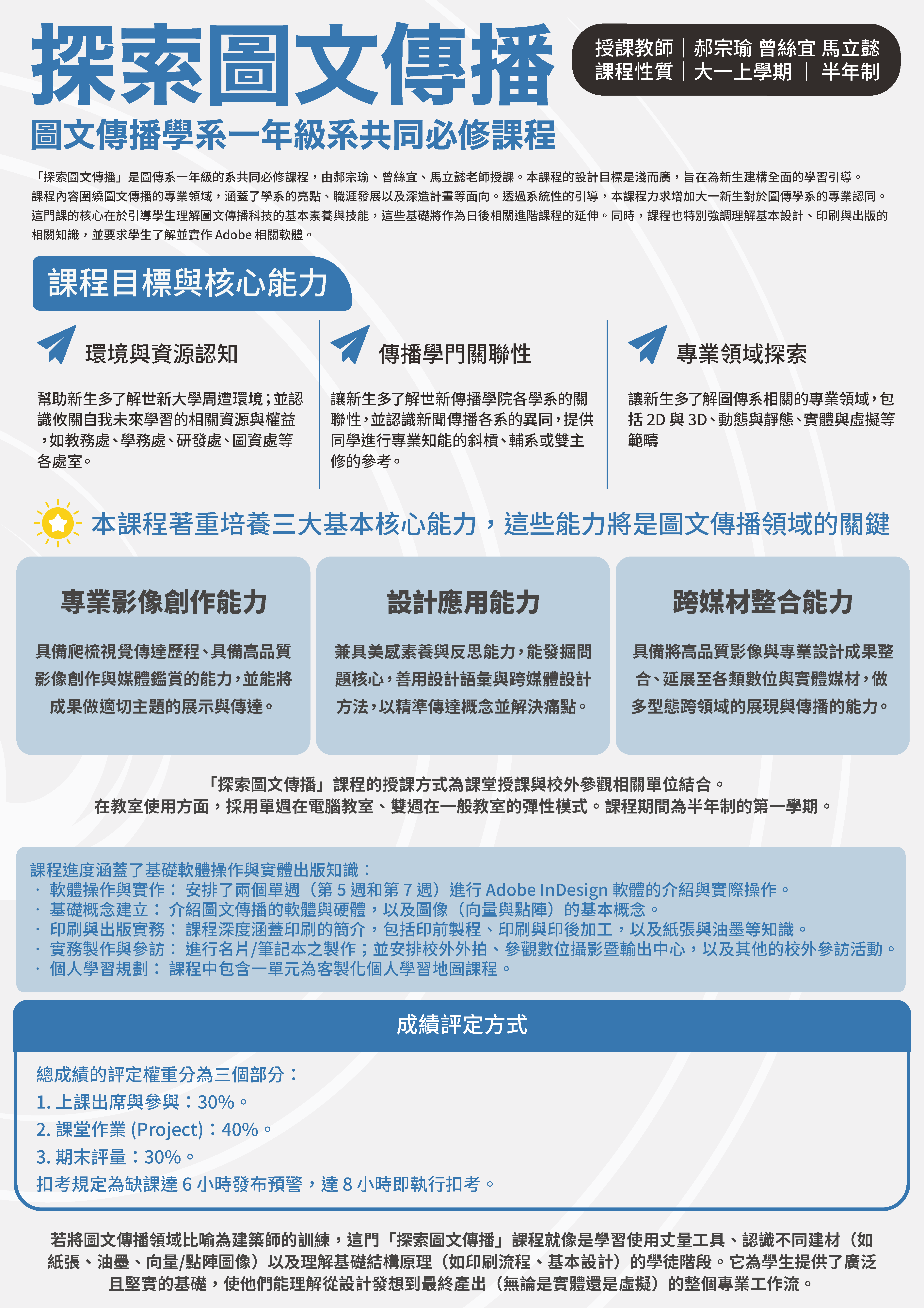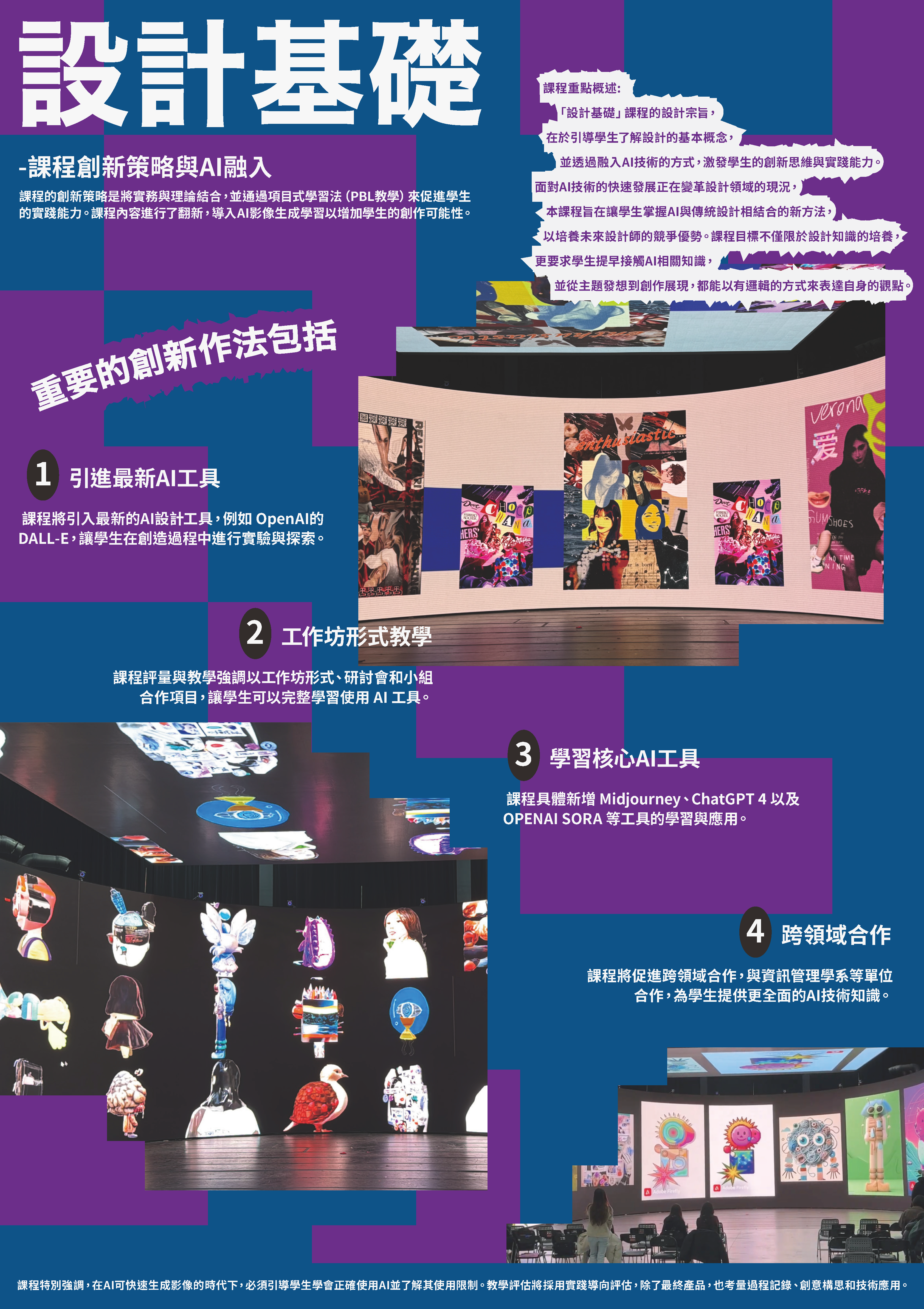 為協助大學新生適應、定向,並透過新開課程自助探索。本計畫以傳院課程設計為主軸,新開一門大一八系必修課程,「生成式AI素養與傳播技能」,及結合兩門系必修「探索公關廣告」、「探索圖文傳播」,另分別將AI素養融入新聞學系、圖傳系與公廣系,調整五門課程分別為「全媒體識讀」、「設計基礎」、「新聞攝影與構圖」、「全媒體出版科技」、「初階數位圖像廣告製作」,讓全校學生在基礎核心素養的養成過程中,不僅能吸收專業知識、且能在以人為本的基礎上反思相關議題與社會責任,尤其AI對大學生學習的指引與影響,並激發主動求知的探索精神,培養實事求是研究性格。本計畫將推動重點與方法包括:透過課程導入AI資料治理與法律素養、透過課程導入資訊倫理素養、透過課程導入媒體素養與假訊息辨識能力在人工智慧時代,媒體素養教育需要建構與人工智慧相關的知識和技能,透過課程讓學生學習AI時代下,必須重新認識的媒體與資訊素養,從世新校園出發,讓未來的媒體人都能有基本的媒體識讀力並正確使用媒體,辨別真假訊息。