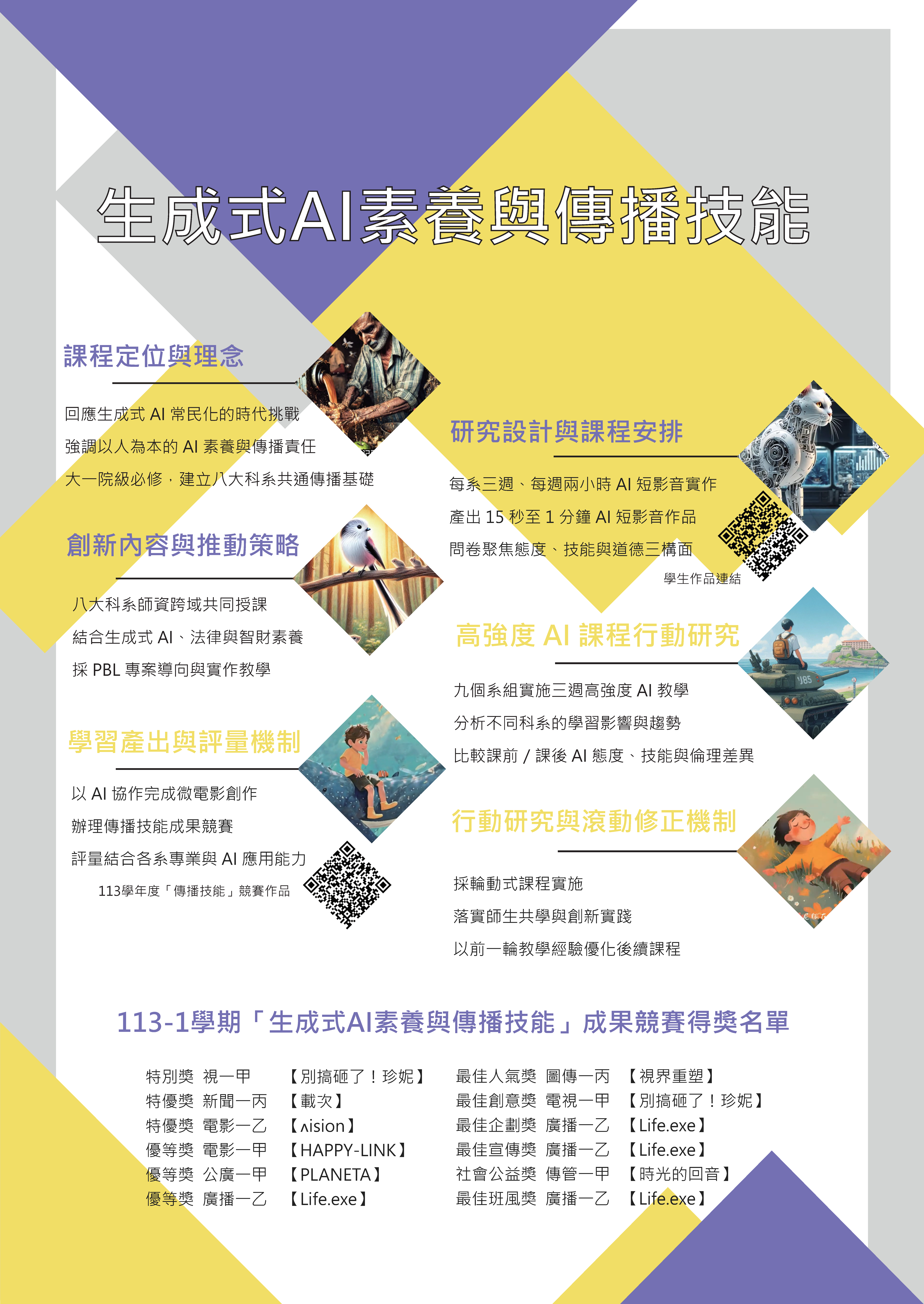 本計畫為因應2023年生成式AI的爆發性成長與常民化應用,如何適時加入「以人為本」的深度關懷與科技始終來自人性的正當理解與應用新科技素養,發揮傳播人的引領角色,進一步引申定義各系各項傳播能力素養的實質內涵,發展數位行動能力,強化AI敘事與跨文化溝通能力,增強媒體解讀與批判能力,強調社會視野與草根行動,養成以問題解決為導向的學習探索習慣,培養自身的學習韌性,調適自我學習方式以適應快速變遷的外在環境,藉以培育保持探索精神且可靈活運用所學,提升學業成就,具高度學習韌性的新世代人文與AI素養人才。