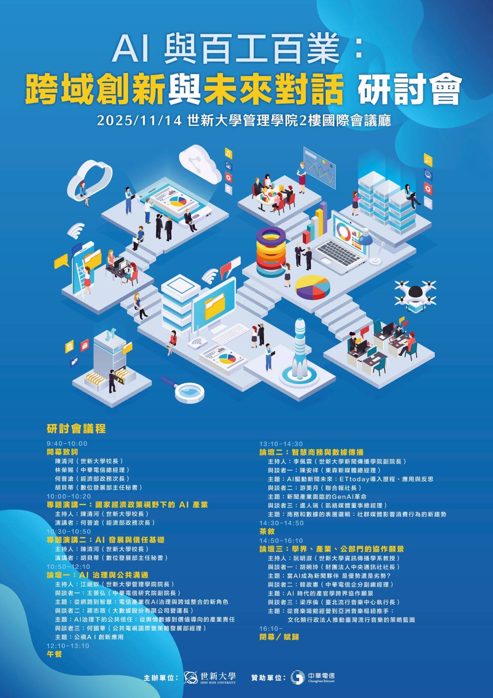 本研討會將以「AI與百工百業:跨域創新與未來對話」為主題,邀集學界、產業界與公部門代表,從AI 治理與公共溝通、智慧商務與數據傳播、產官學協作願景、百工百業的 AI 創新與實踐等多重面向出發,建構跨域對話平台,探索未來數位傳播與智慧電信的發展藍圖,並期望引領新世代 AI 人才邁向應用實踐與永續創新之路。